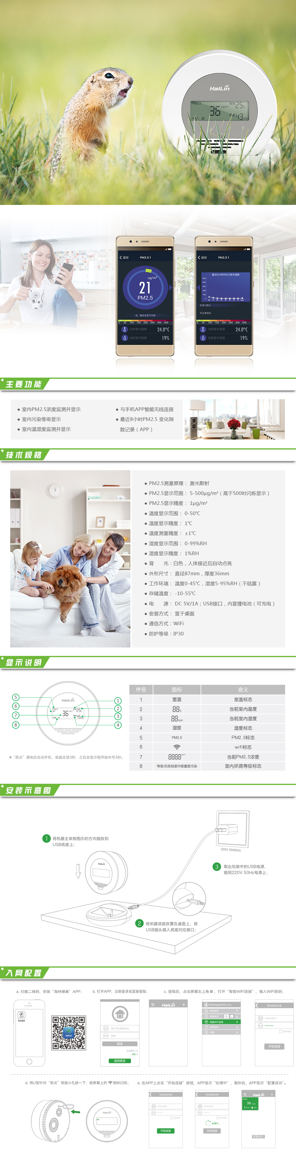 “原點”一改傳統(tǒng)傳感器及控制器的工業(yè)造型,采用圓形外觀,以白色為主色調(diào),造型簡潔高雅;在確保對于室內(nèi)空氣PM2.5濃度、溫度及濕度探測同時,更實現(xiàn)了與室內(nèi)裝飾環(huán)境的完美融合。激光檢測原理對空氣中的PM2.5污染物進行檢測,并由微處理器對檢測數(shù)據(jù)進行運算;最終結果以數(shù)值及污染等級的方式顯現(xiàn),簡單直觀。帶WIFI通訊及紅外感應功能,采用USB電源供電,通過海林手機APP軟件可實時監(jiān)測室內(nèi)的PM2.5濃度,方便快捷。