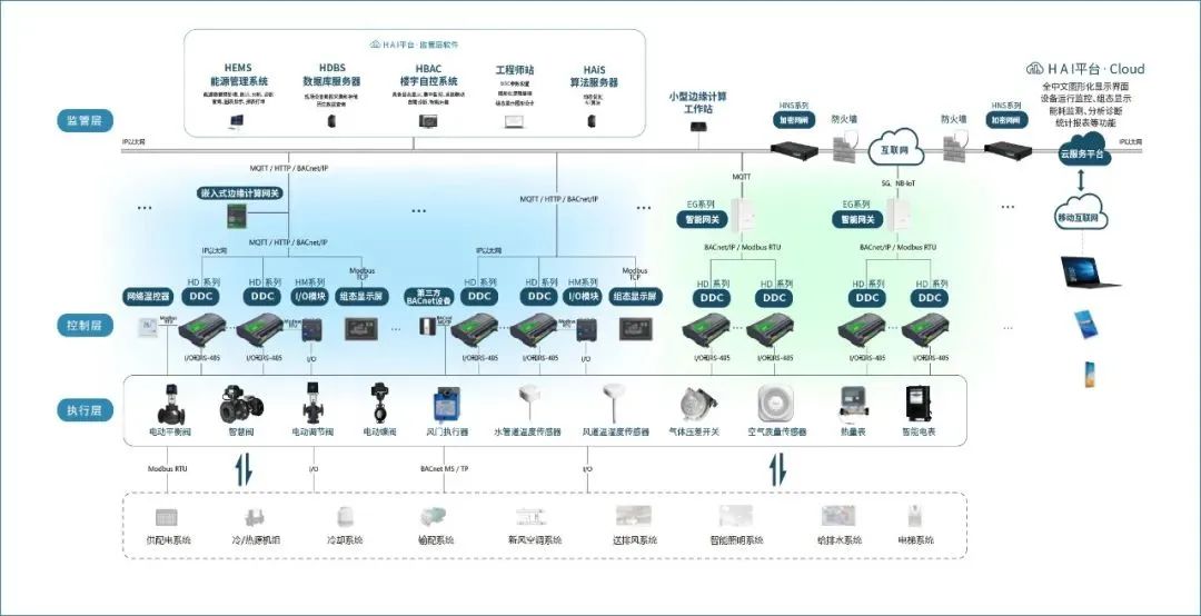 EBA能源樓控系統(tǒng)具體包括Lora無線聯(lián)網(wǎng)計量一體型溫控器、智能網(wǎng)關(guān)、邊緣計算網(wǎng)絡(luò)引擎、IOT-DDC、HAI可視化智慧運營運維運管平臺等明星產(chǎn)品及平臺,智能管控覆蓋暖通空調(diào)機房冷熱源設(shè)備、水泵等輸配設(shè)備以及室內(nèi)環(huán)境側(cè)風(fēng)機盤管等空調(diào)設(shè)備。