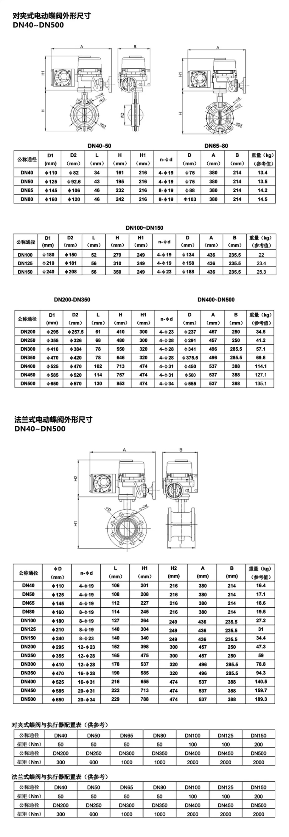 以下為海林對夾式和法蘭式電動蝶閥的工程尺寸和相關(guān)重要參數(shù)。